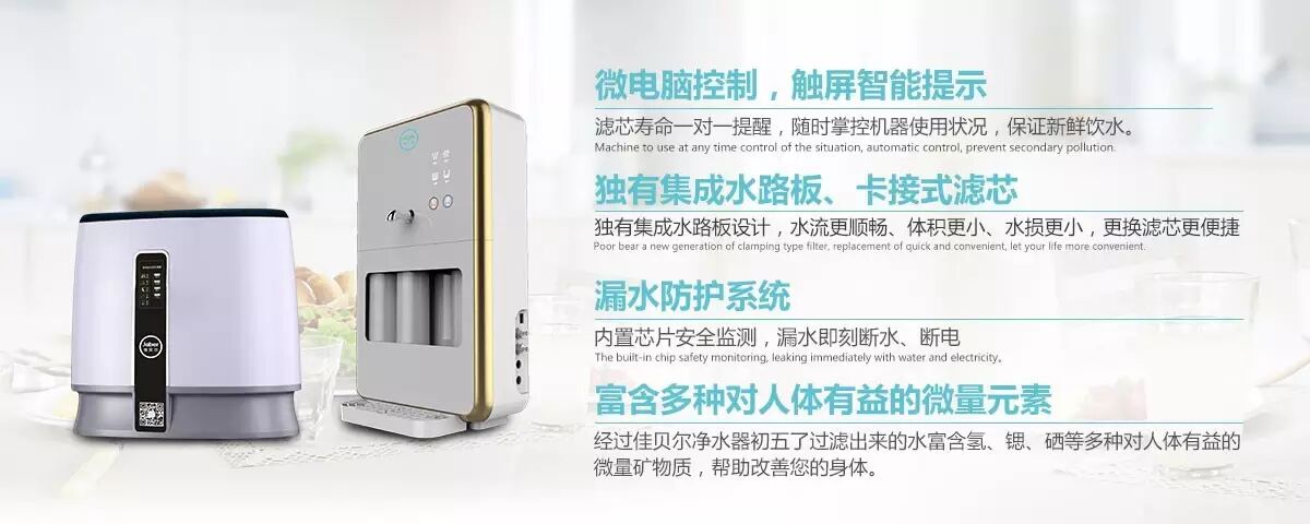 “水波纹”和“超薄加热一体机”是佳贝尔净水器公司潜心多年设计、研发的新品。机身内部采用佳贝尔专利技术,整体外观设计独具匠心,集成水路版,内部所有接头集成一体,实现无缝衔接,漏水隐患降低了90%;卡接式结构的滤芯让滤芯更换更轻松,独立提醒的智能提醒功能,也让净水器运转状况时时显示在LED显示屏上,使用省心,更换轻松。400G大流量反渗透膜出水更快,因此该款纯水机抛弃了储水罐,现制现饮,避免死水残留,直饮更新鲜。更让人眼前一亮的是特有的再矿化技术,补充了人体必需的“富氢”、“富硒”、“富锶”等微量元素,保持人的青春活力。